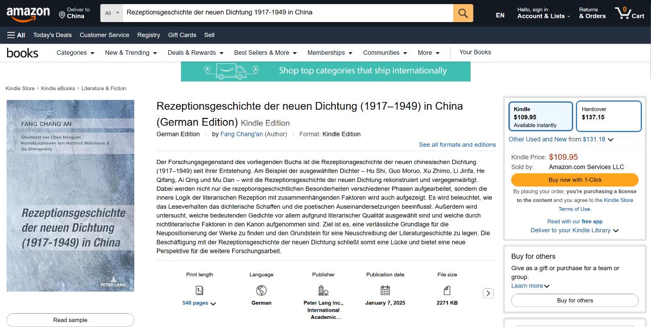 近日,WilliamHill官网方长安教授的专著《中国新诗(1917-1949)接受史研究》德文版,在国际权威出版社兰培德国际学术出版集团出版发行。译者是上海外国语大学陈虹嫣副教授,译文由德国汉学家魏汉茂和旅德学者顾正祥教授校阅。