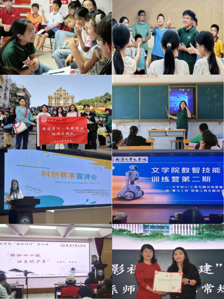 大力推动创新实践与志愿服务,组建13支实践队开展“推普助力乡村振兴”等专业实践,赴澳门开展汉语教育行走调研,获评教育部、团中央优秀团队、学校先进单位、实践风采大赛特等奖,得到《中国青年》杂志、学校官微专题报道。举办“数智技能训练营”“文筑红楼”跨学科论坛,首次举办“自强杯”院赛,院级社团“散木工作室”孵化为初创企业;分层分类助力学院生涯规划指导,具体实施“经纶计划”就业促进行动,培养学生文字创意核心竞争力;新成立的学生创新实践与志愿服务促进中心获评校“学雷锋志愿服务月”先进集体。
